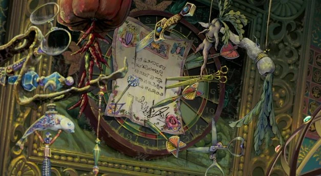 Staub wirbelt in der Luft und kleine Insekten, die Einwohner des Schlosses, fliehen, weil Sophie den Boden fegt. Markl trägt die Möbel hinaus und Sophie stellt Calcifer zur Seite, um die Asche im Kamin wegzutragen. Hauro kommt, um Calcifer vor dem Ausgehen zu bewahren. So kommt der Dämon wieder auf seinen alten Platz und er bekommt frisches Holz zum Verbrennen. Er warnt Sophie es mit dem Putzen nicht zu übertreiben, bevor er das Schloss verlässt. Die Türscheibe dreht sich auf Schwarz. Der Dämon offenbart Sophie den Fluch zwischen ihm und Hauro: Wenn der Dämon stirbt, stirbt Hauro mit.