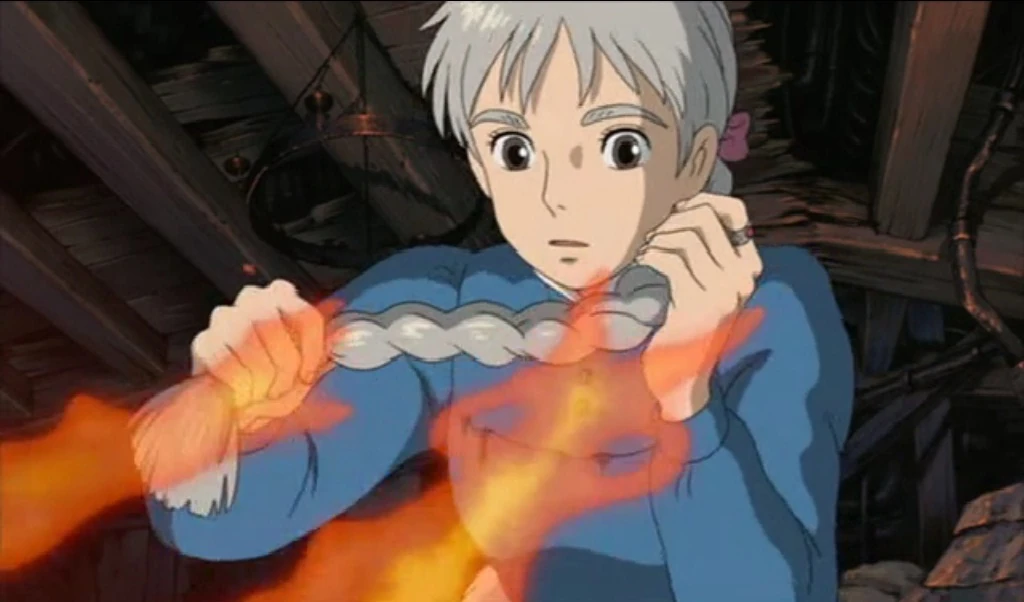 Sulimans Gummimänner und Flugmonster torkeln Sophie, die schon bald die Tür hinter sich schließt, entgegen. Im Schloss dreht sie an der Türklinge zum Niemandsland, wo sie ihre Heimatstadt in Flammen sieht. Hauro kämpft, um Sophie zu beschützen alleine gegen Sulimans Monster an. Sie will ihm helfen, indem sie ihre Spur verwischen: Alle verlassen das Schloss, auch Calcifer, der anmerkt „Mach mich nicht dafür verantwortlich, wenn etwas passieren sollte.“ Als Sophie Calcifer aus dem Schloss trägt, fällt es in sich zusammen. Nun kann Suliman sie nicht mehr finden.