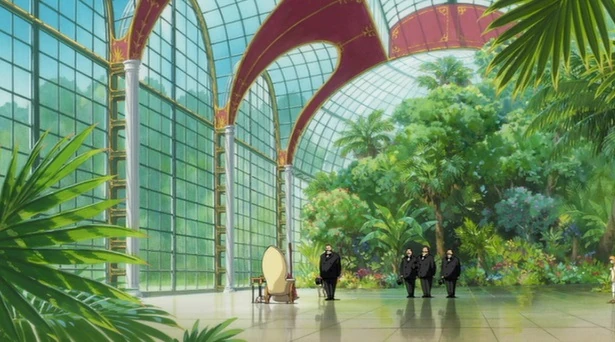 Doch in einem Punkt widerspricht Suliman ihr, dass Hauro kommen wird, weil sie seine Schwäche kennt. Der König kommt von oben mit einem Kajak angeflogen. Er tritt vor Suliman, um sie zu grüßen, bevor er sich zu Sophie wendet. Ein weiterer Mann stolziert herein, um Suliman ein Dokument zu zeigen. Er ist sich sicher, dass er den Krieg gewinnen wird. Als er sich zum König schaut, lacht er. Er preist Suliman, dass sein Doppelgänger ihn gut getroffen hat. Dann verlässt er das Gewächshaus, um sich in Siegesstimmung mit seinen Generälen zu beraten. Hauro verwandelt sich zurück, weil seine Tarnung aufgeflogen ist. Suliman schwingt ihren Stab, worauf sich die Umgebung in den Welttraum verzieht. Beängstigt krallt sich Sophie um Hauros Arm, der sich schon bald in schwarz bedeckt sein wird. Viele Männchen tauchen auf, die sich an den Händen im Kreis tanzen. Ihr Schatten werfen sich alle zielgerichtet auf Hauro, Sophie und der Hexe, damit sie nicht mehr fliehen können. Als Suliman ihren Stab auf den schwarzgefederten Hauro richtet, hält Sophie ihn vom Angriff zurück. Dann stürmt Hauro mit ausgebreitetem Flügel durch das Dach hinaus.