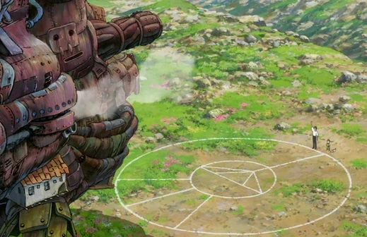 Sophie und Hin befinden sich in einem Häuschen, das im geheimen Garten liegt. In der Mitte des Raums scheint das Mondlicht hinein auf einem Tisch voller Instrumente und Papiere. Hin kratzt an einer Tür, die Sophie öffnet. Der Ring vibriert und droht sich aufzulösen. Vom Himmel fallen Dämonen in Form von Sternschnuppen, die dann auf dem See fallen und ertrinken. Sophie erblickt im Meer von Sternschnuppe Hauro in jungen Jahren, der gerade Calcifer fängt. Darauf isst er ihn und zieht ihn wieder aus seinem Herz hervor. Calcifer hat nun die Form, wie Sophie ihn kennt. Der Ring gibt seinen letzten lautlosen Schrei, bevor er sich auflöst. Sophie und Hin fallen in einem lichtlosen Abgrund. Sie ruft Hauro und Calcifer zu, dass sie auf sie warten soll.