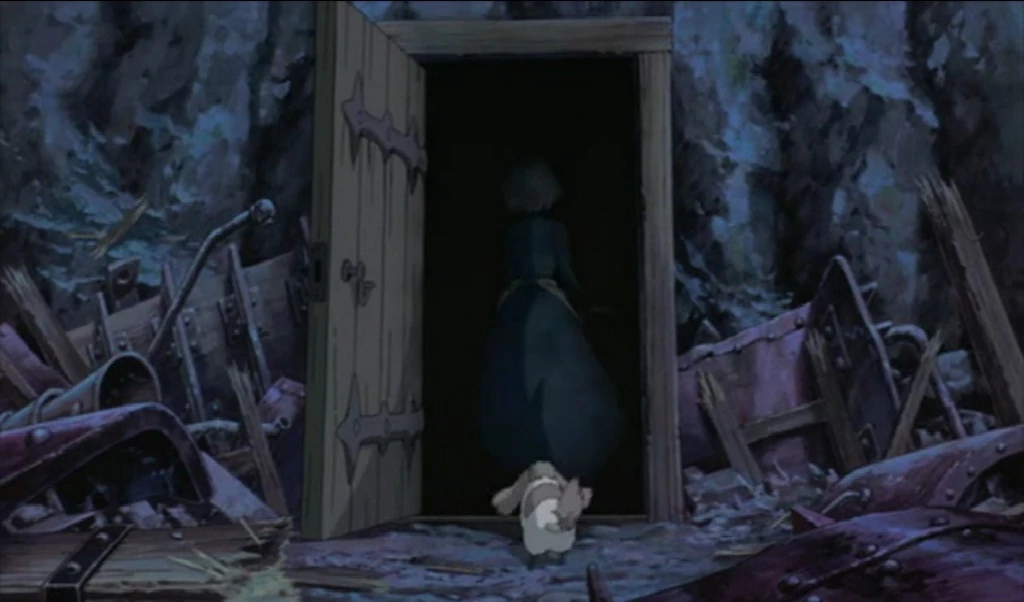 Das Schloss zerbricht erneut, wodurch Sophie und Hin von den anderen getrennt werden, und stürzt einen Abgrund herunter. Sophie fängt an zu weinen, weil sie dachtet, dass sie, da sie Wasser über Calcifer geschüttet hat, Hauros Tod verursacht hat. Der Hund Hin keucht, um Sophie auf den Ring aufmerksam zu machen. Denn der Ring leuchtet türkis auf und gibt einen blaufarbigen Strahl aus. Sophie folgt dem Strahl, die zu einem Tür führt. Als sie die Tür öffnet, erblickt ihr nur die Finsternis entgegen. Jedoch hält es sie nicht davon ab hindurch zu gehen, um Hauro wiederzusehen.