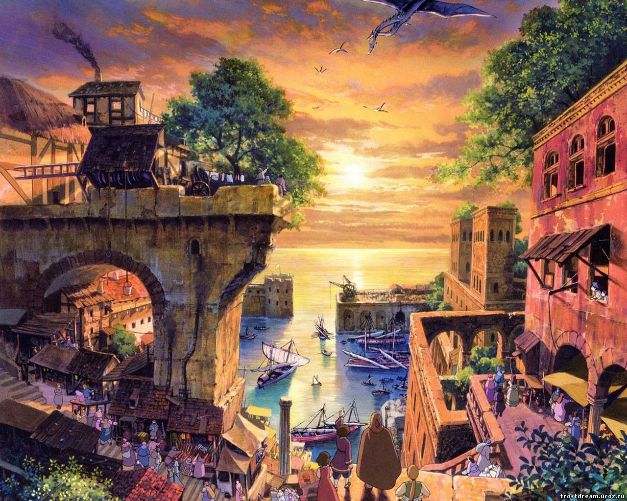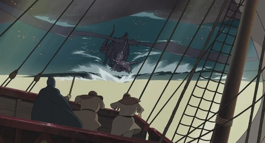 Einige Matrosen gehen voller Ehrfurcht und Neugier in deckung, als ein rotäugiger Drache vom Himmel an ihnen vorbeidüst. Dem Drachen folgt ein Streifen aus Feuerfunken und tropfendem Blut. Zu ihm gesellt sich ein anderer Drache, um seine Krallen in sein Fleisch hineinzubohren. Der verletzte Drache schnappt seine Flügeln zusammen und fällt hinunter. Doch der siegreiche Drache lässt von seiner Beute nicht ab und frisst ihn.