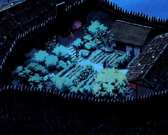 In dem prächtigen Garten arbeiten die Aussätzigen (jap. Byousha) als Schmiede daran, die Gewehre zu verbessern. Der Garten ist geheim und liegt abseits vom Rest der Eisenhütte. Wegen ihrer Krankheit sind die Ausgestoßenen mit Bandagen umwickelt. Sogar ihr Gesicht ist bedeckt und nur die Augen sind frei. Von den Nicht-Aussätzigen bekommen sie das nötige Essen, aber sie müssen sich gegenseitig umeinander kümmern. Denn man befürchtet, dass sie andere anstecken könnten. Daher leben sie abseits in einem Garten, welcher als Ort für die Quarantäne genutzt wird. Sie empfinden Mitgefühl mit Ashitaka, der wie sie mit einem vermutlich unheilbaren Leiden leben muss. Eboshi verachtet die Aussätzigen nicht, sondern nimmt sie in ihrer Gruppe auf, gibt ihnen Schutz und eine Beschäftigung.