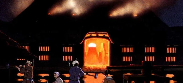 Die Eisenhütte, auch Eisenstadt genannt, aus dem Film Prinzessin Mononoke von Hayao Miyazaki aus Studio Ghibli steht unter dem Kommando von Eboshi und dient der Produktion von Eisenerz für die Waffenherstellung.