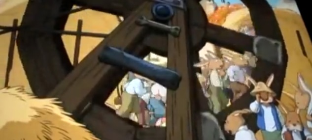 Mister Teig, Apfelwurm und Ei-Prinzessin haben den Schloss im finsteren Wald verlassen und kommen auf Felder, wo die Hasen arbeiten. Das Getreide wird von ihnen geerntet und zur Stadt gefahren.