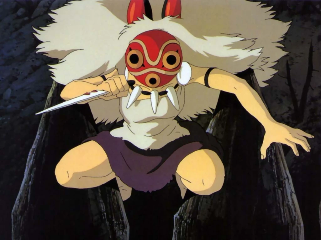 Ashitaka geht am Bach entlang und rettet zwei der Verlorenen und er beobachtet die Wölfe: Das Wesen trägt keine Maske und hat das Gesicht eines Menschen. Doch sie saugt wie ein Wolf das giftige Blut aus Moros Wunde. Es ist eine junge Frau genannt San. Sie trägt ein weißes Fell und hat eine rote Fangzahn-Bemalung im Gesicht als sei sie kein Mensch, sondern eine Wölfin. Ashitaka stellt sich ihr vor und fragt nach dem Waldgott. San hält kurz inne und geht ohne Erwiderung mit den Wölfen weg. Aus der Richtung der Geretteten ertönt ein Schrei. Ashitaka weiß, dass es keine Wölfe sein können, die die Männer bedrohen.