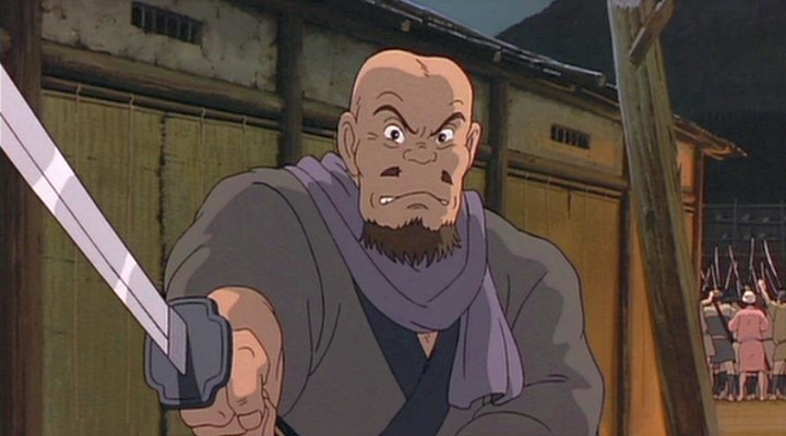 Langsam nähert Ashitaka sich Gonza, der mit beiden Händen am Schwertgriff drückt. Doch er verbiegt Gonzas Schwert nur mit seiner rechten Hand und geht an ihm widerstandslos vorbei. Er schiebt die Menschen zur Seite und drängt sich so zu den kämpfenden Frauen vor.