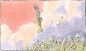 Sie drängt Shuna dazu sich aufzumachen und die Kleider über das kleine Beet zu legen, um [den Weizen] zu schützen. Sie werden weit zurückgestoßen vom heftigen Hagelregen. Die Wiese um sie herum wird zerdrückt. Alles wird stockdunkel, als der Sturm losheult.