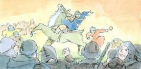 Das stolze Tier wirft gekonnt alle von sich herunter, die auf ihm zu reiten versuchen; einen nach dem anderen. Die Dorfbewohner brechen in schallendes Gelächter aus.