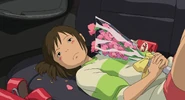 Chihiro lay in seat holding flowers