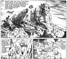 Mito, with the crew of the Valley Gunship and Barge, arrive at the mining town searching for NausicaƤ [5]. There, they encounter the innkeeper that Yupa left Kui with trying to steal the Horseclaw but she is defended by the innkeeper's daughter [6].