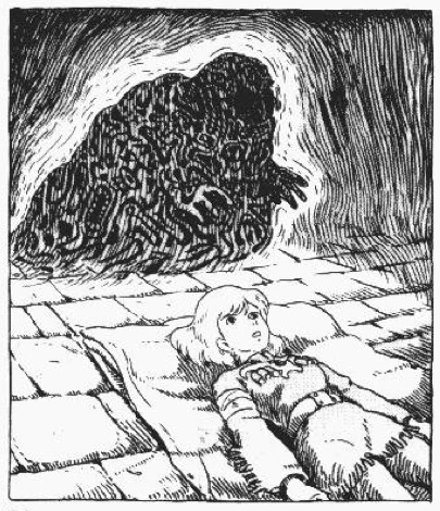 His dark spirit searches for Nausicaä after she is wounded [7] but she lays still and is able to avoid him [8]. His dark spirit is blind, cold and filled with hate.