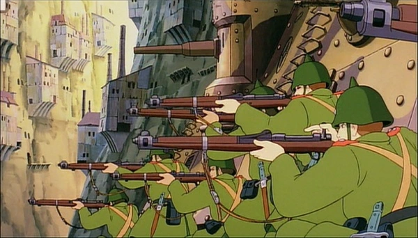 The soldiers are a part of the king and government's military in the movie Castle in the Sky.