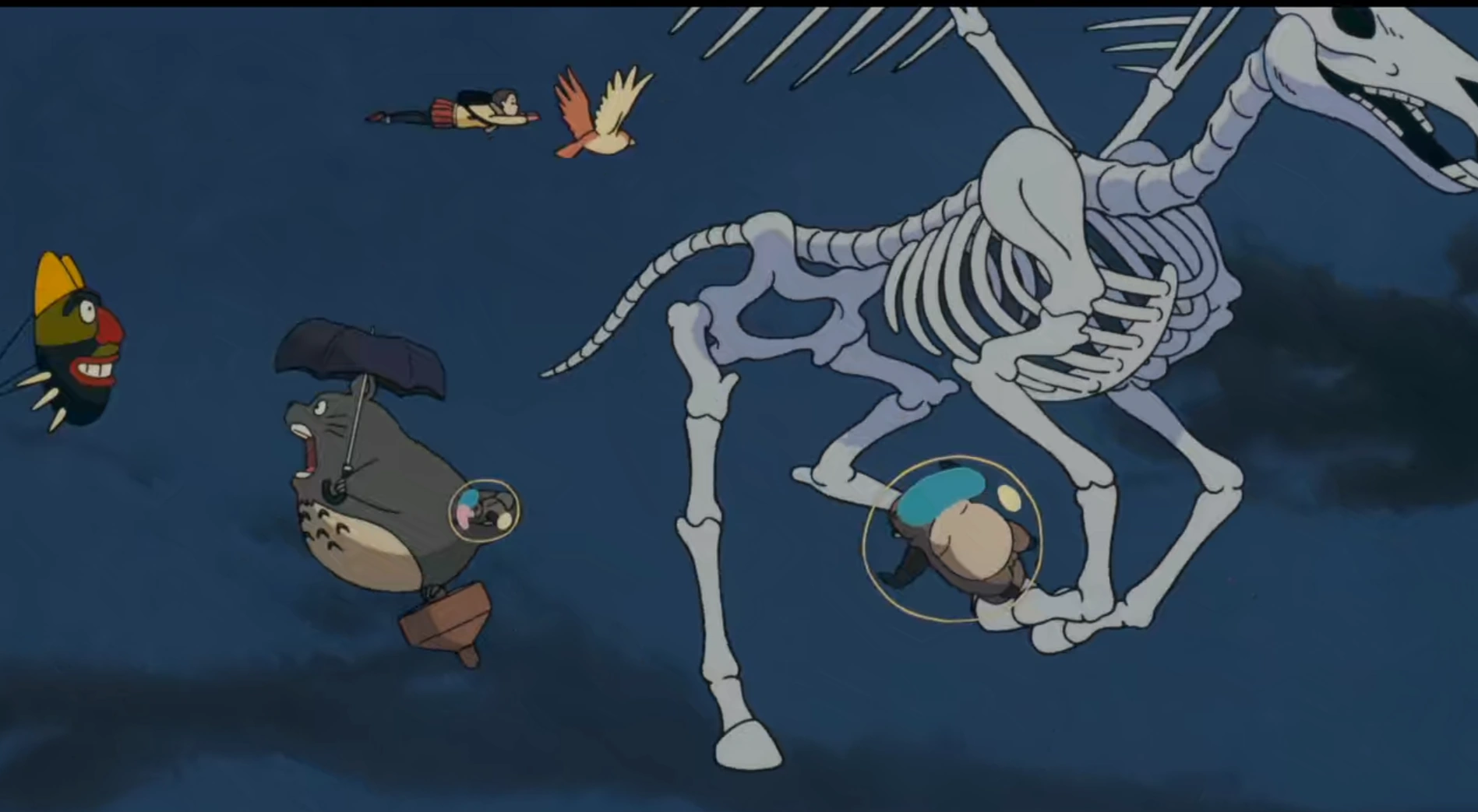 In the end credits, Mei and Satsuki's mother returns home, and the sisters play with other children, with Totoro and his friends as unseen observers.