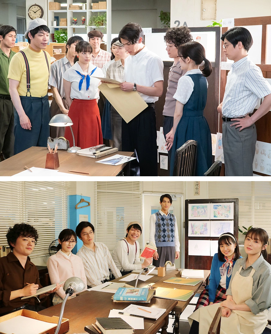 Sometani Shota plays a character based on Hayao Miyazaki, while Suzu Hirose's character is based on Reiko Okuyama and Nakagawa Taishi plays Isao Takahata. The trio worked in a studio the produces a show called Laura, the Prairie Girl, which is based on Heidi, Girl of the Alps.