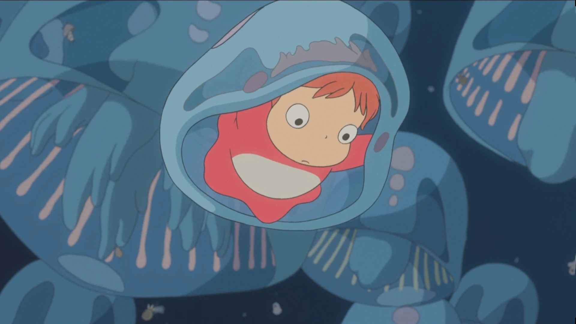 Fleeing her overbearing father, little Ponyo floats away on a jellyfish.