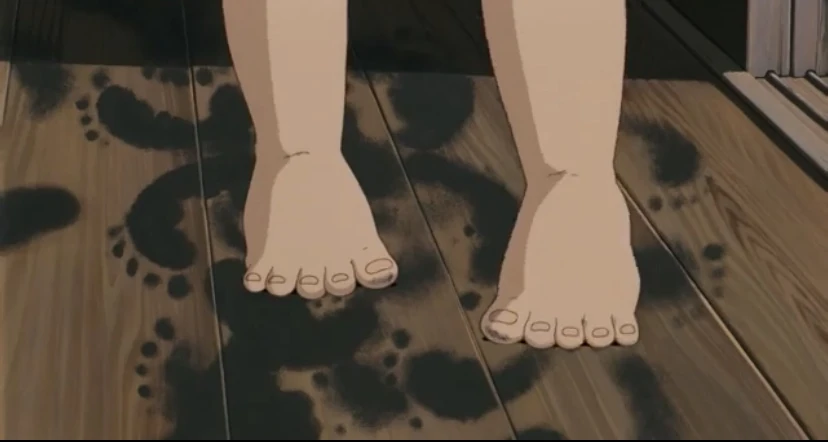 Sootballs appear again when Chihiro returns in the Boiler Room for going outside, so they bring her back her shoes and socks. Chihiro thanks them, and then she puts on her shoes. Strangely she doesn't wear the socks again, taking them in her hands instead of wearing them.